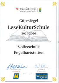 Die Volksschule Engelhartstetten hat sich erfolgreich um das Gütesiegel „Lese.Kultur.Schule“ des Landes Niederösterreich beworben und alle notwendigen Kriterien erfüllt. Damit erhält unsere Schule bereits zum dritten Mal in Folge diese besondere Auszeichnung, die für die kommenden zwei Jahre gilt.