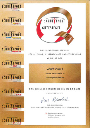 Das NÖ Schulsportgütesiegel ist eine Einrichtung des Landesschulrates für Niederösterreich in Zusammenarbeit mit dem Amt der NÖ Landesregierung und stellt eine Auszeichnung und Anerkennung dar, die an Schulen verliehen wird, die sich durch besondere Aktivitäten und Initiativen auch über den Bereich Bewegung und Sport hinaus um ein bewegungs- und gesundheitsorientiertes Schulleben bemühen. Dies ist ein Qualitätszertifikat für die Schule, welches wir seit dem Schuljahr 2020 in Bronze führen.